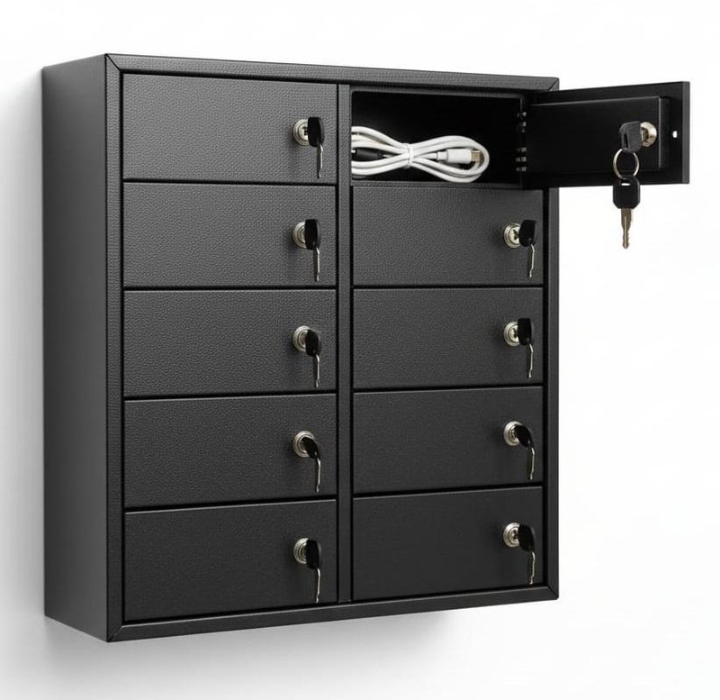 Стильная станция для безопасной зарядки любых смартфонов. Устройства надежно защищены в персональных ячейках с металлической дверцей и замком. Пользователю достаточно просто подключить телефон к универсальному кабелю (3 в 1) и закрыть ячейку на ключ.