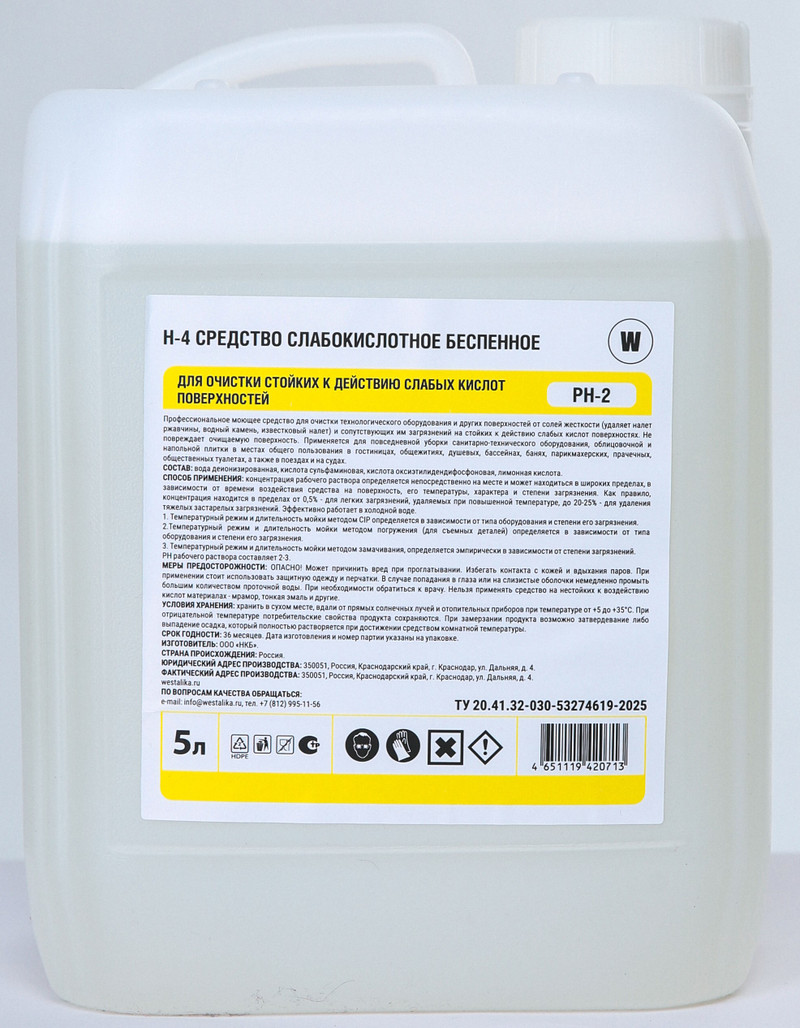Чтобы купить H-4 Средство слабокислотное беспенное, pH-2 WA508005 оптом по цене по запросу, свяжитесь с поставщиком. Компания поставщик — НКБ (ООО «НКБ») из города Санкт-Петербург. Доставка возможна самовывоз, транспортной компанией. Способы оплаты: наличными, безналичная оплата.