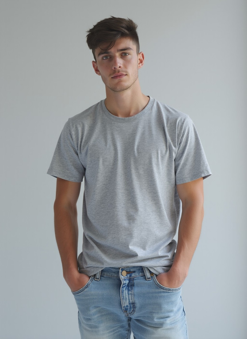 Однотонная базовая мужская футболка прямого кроя с округлым вырезом горловины в цвете серый меланж от российского бренда НКstyle.