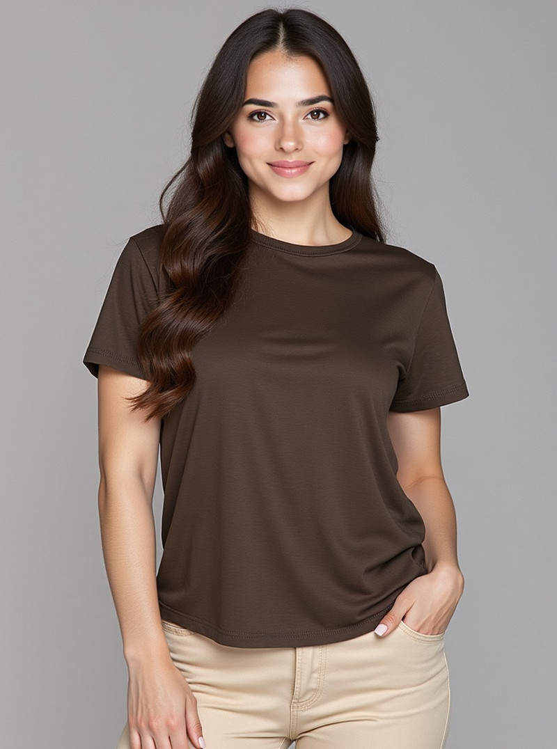 Однотонная базовая футболка прямого кроя с округлым вырезом горловины в цвете горький шоколад от российского бренда НКstyle.