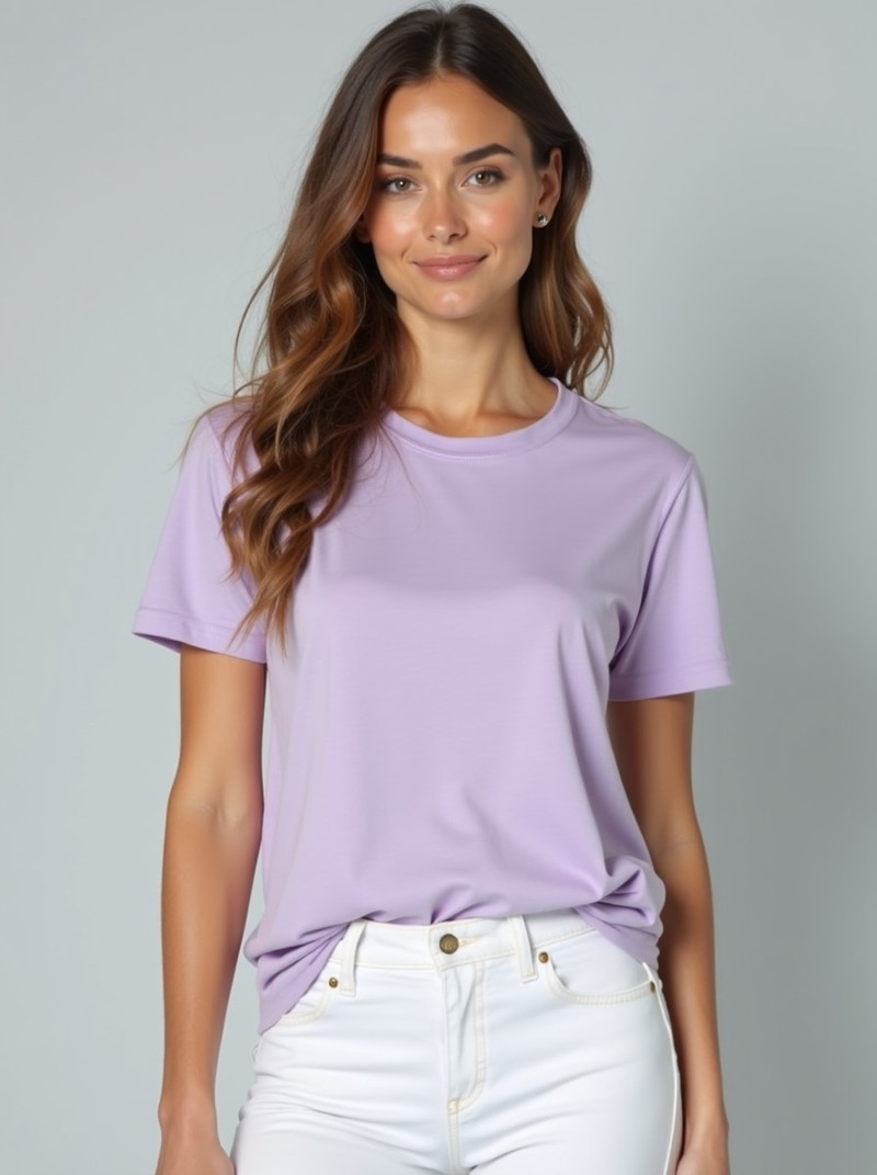 Однотонная базовая футболка прямого кроя с округлым вырезом горловины в нежно-сиреневом цвете от российского бренда НКstyle.