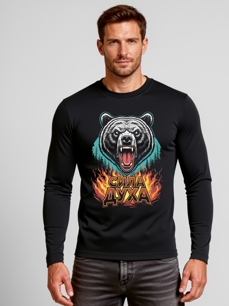 Представляем вам наш уникальный мужской лонгслив с принтом в черном цвете, который обязательно станет стильным дополнением к вашему гардеробу.