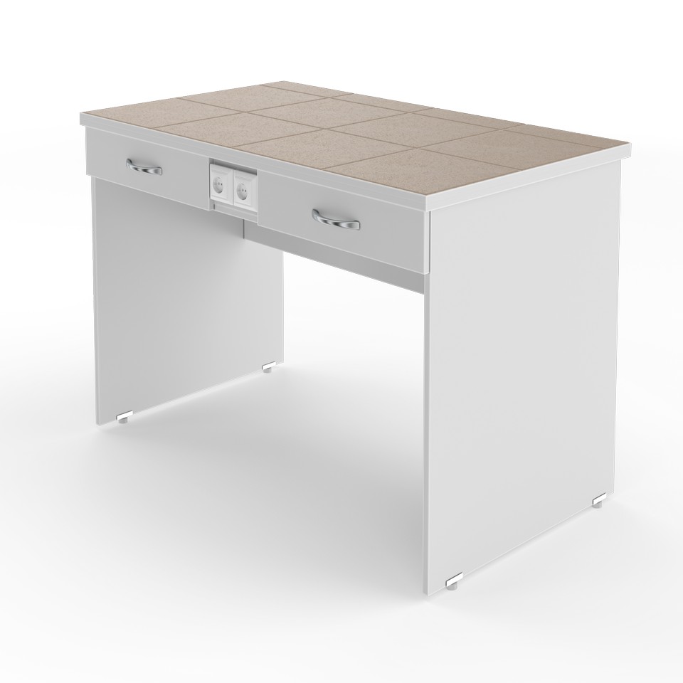Столешница выполнена из керамогранитной плитки. Плитка влагостойка и отлично выдерживает высокие температуры. Устойчива к продолжительному воздействию концентрированных кислот, щелочей и органических растворителей. Ограниченно стойка к плавиковой кислоте. Это один из самых популярных видов материалов столешниц для лабораторной мебели.
