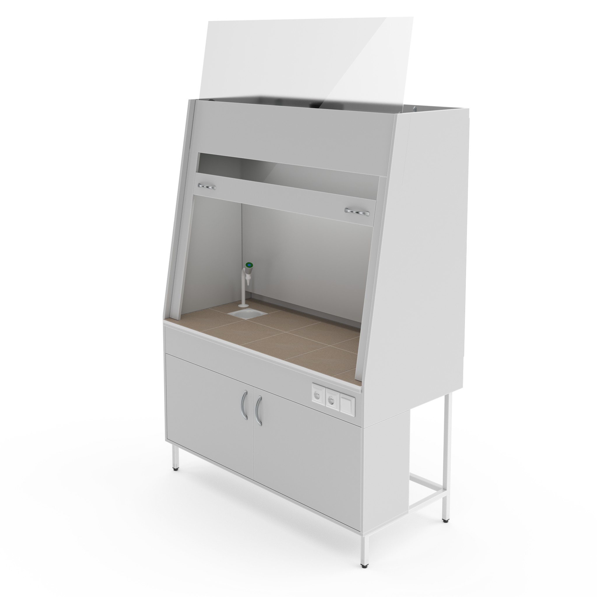 Рабочая зона закрывается одной подъёмной рамой с противовесом. В ней есть две зоны вытяжки: купол вытяжного бокса и уровень столешницы. Диаметр фланца для подключения к системе вентиляции: 150 мм.