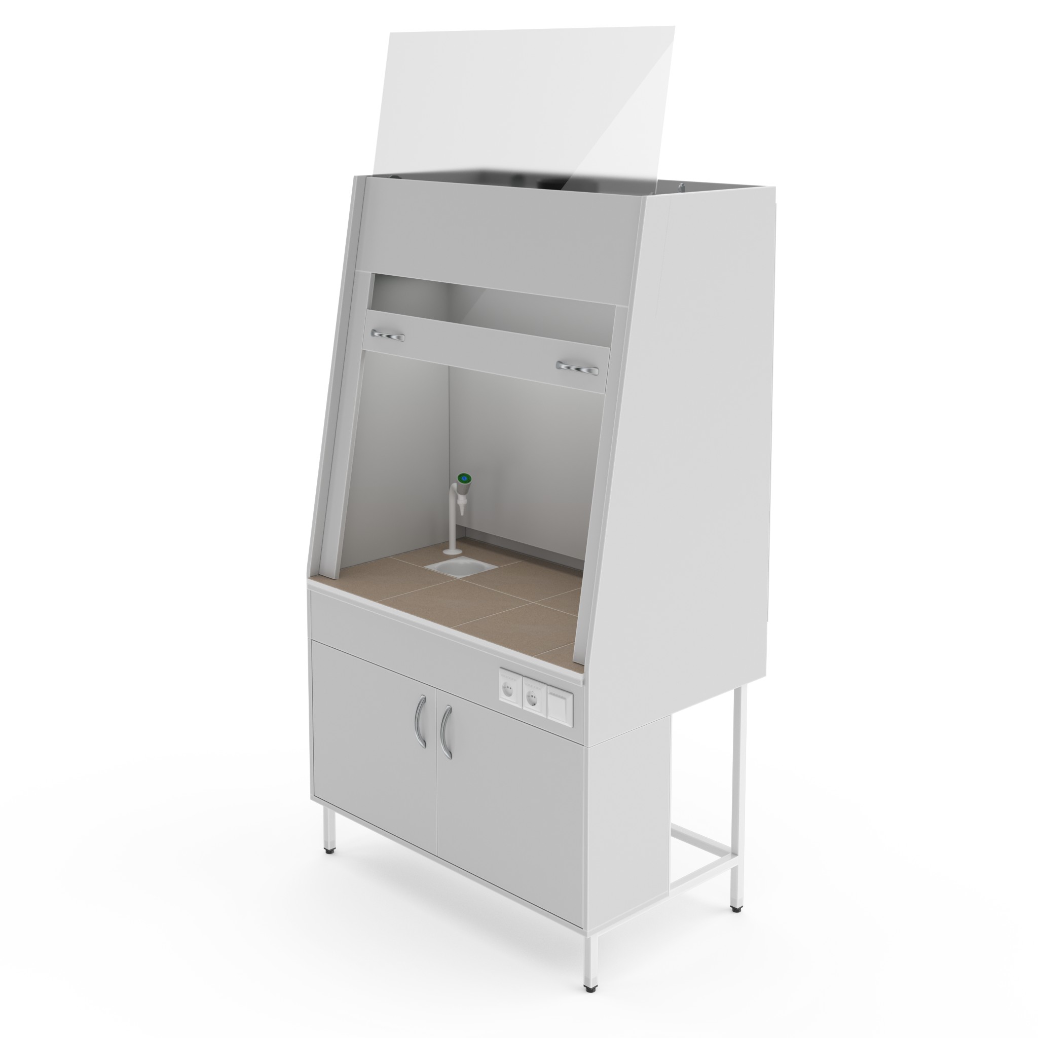ШВ-1200 КГ-С — это компактный однорамный вытяжной шкаф со столешницей из керамогранитной плитки, краном и небольшой встроенной раковиной из полипропилена.