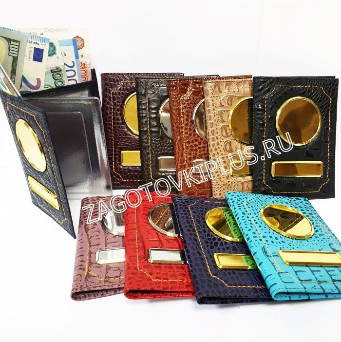 металлические вставками круг и прямоугольник цвета хром или золото на Ваш выбор (уже надежно прикреплены на портмоне)
