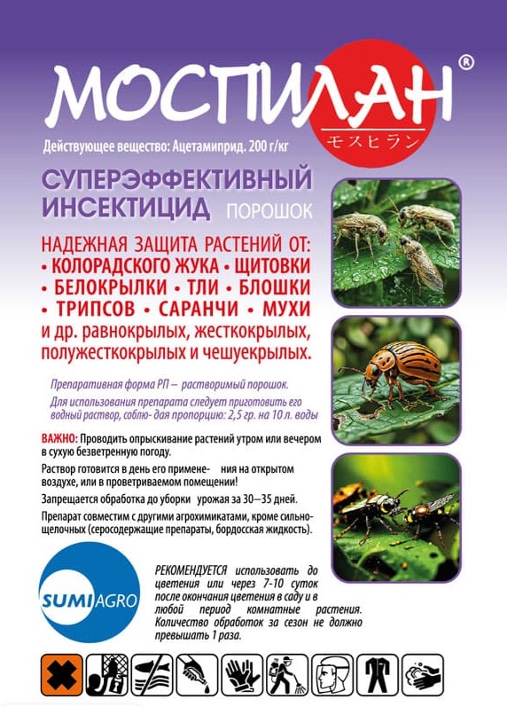 Моспилан — это суперэффективный инсектицид. Защищает растения от колорадского жука, щитовки, белокрылки, тли, блошки, трипсов, саранчи, мухи и других насекомых.