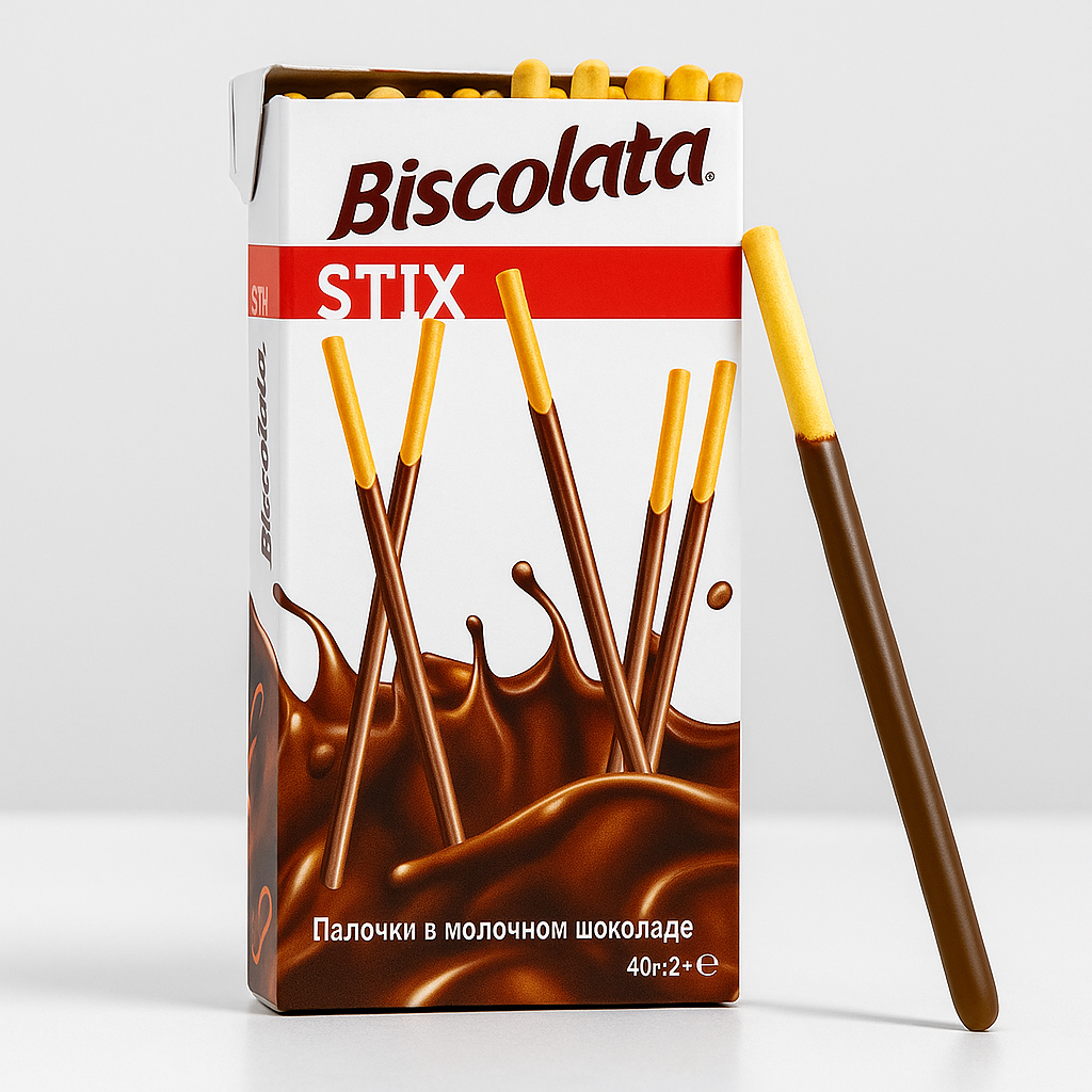 Biscolata Stix — хрустящие бисквитные палочки, щедро покрытые молочным шоколадом. Формат 40 г — удобная порция к кофе, в дорогу или в школьный перекус.