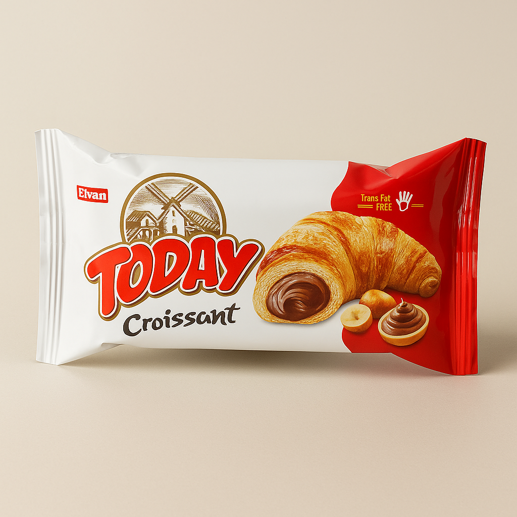 Порционный круассан Today от ELVAN — слоёное тесто и нежная шоколадная крем-начинка. Удобный формат «on-the-go». Официальный EAN: .