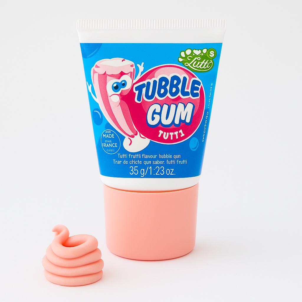 Tubble Gum — легендарная жевательная резинка LUTTI в удобном тюбике: мягкая эластичная масса выдавливается прямо в рот, а вкус тутти-фрутти долго остаётся ярким. Формат 35 г — компактный снек для кассовой зоны, наборов и поездок.