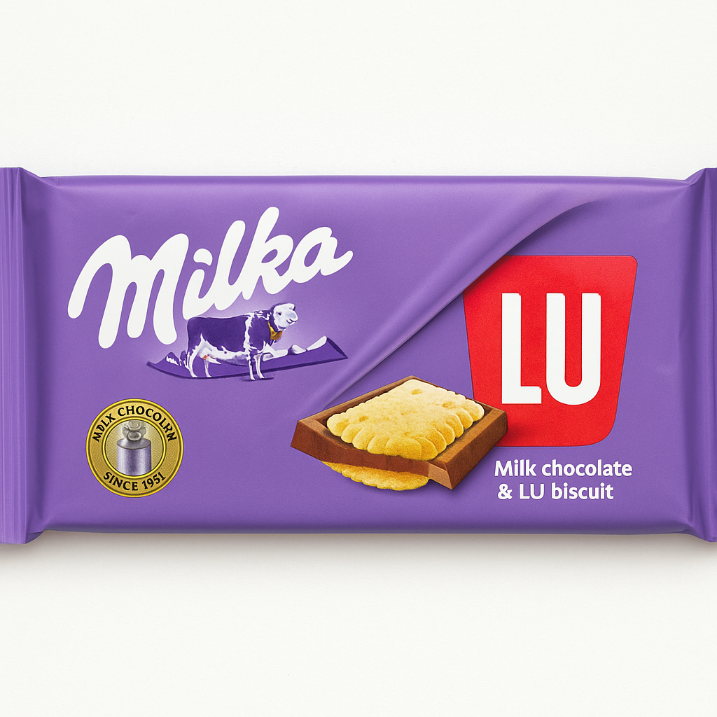 Классическая плитка Milka с хрустящим печеньем LU: кремовый альпийский молочный шоколад и тонкие бисквитные сегменты обеспечивают контраст текстур и яркий вкус.