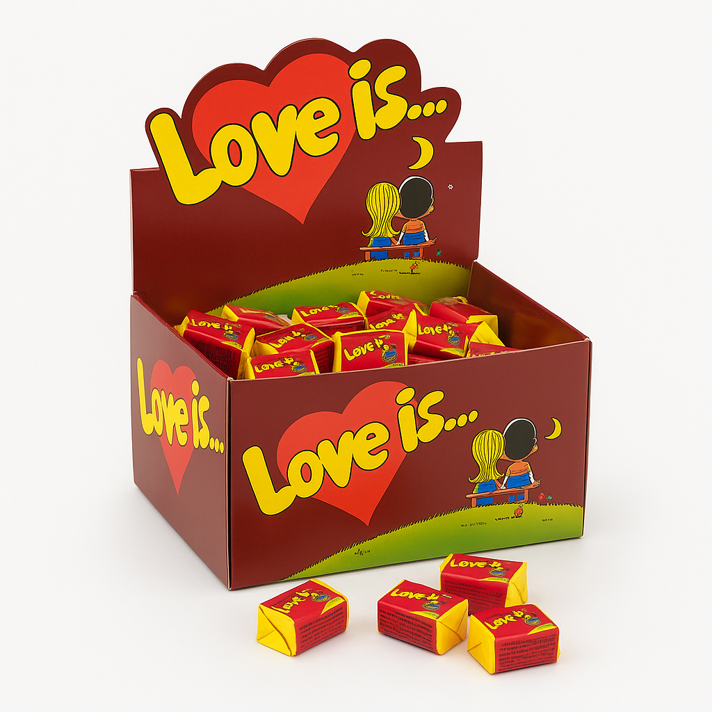 Love Is… — легендарная жевательная резинка с коллекционными фантиками. Вкус «вишня-лимон» сочетает фруктовую сладость и лёгкую цитрусовую кислинку. Формат — индивидуальная конфета 4,2 г, удобная для кассовой зоны, наборов и детских праздников.