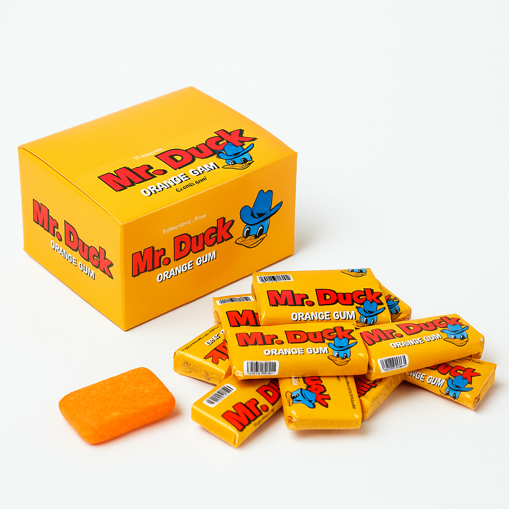 Апельсиновая жевательная резинка «Mr. Duck» — компактный формат 3,5 г для кассовой зоны, наборов и штучных продаж. Яркий цитрусовый вкус, удобная индивидуальная упаковка, стабильное качество от Topgum Pro.