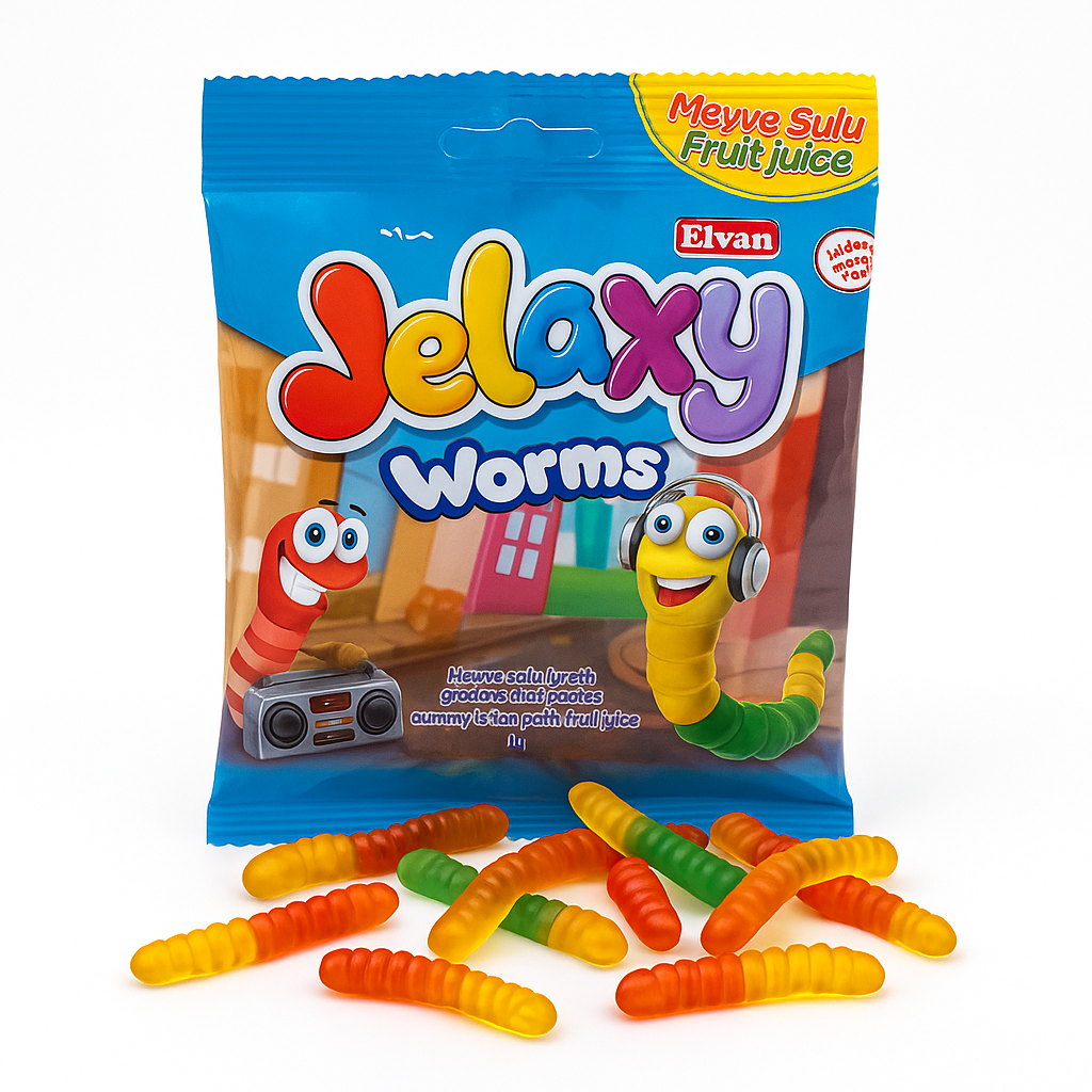 Жевательный мармелад Jelaxy «Червячки с фруктовым соком» — фигурные желейные конфеты с фруктовым вкусом и жевательной текстурой. Удобный пакет 80 г подходит для кассовой зоны, наборов и перекуса в дороге.