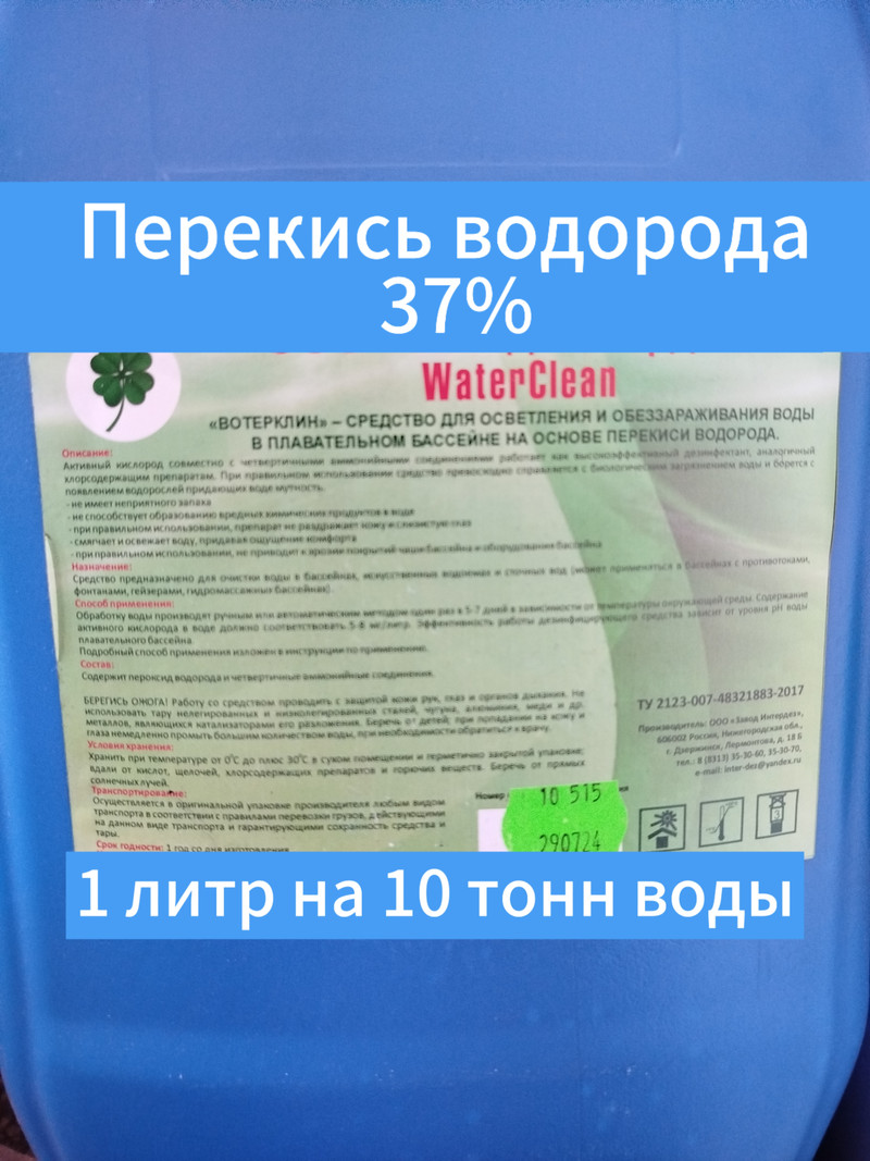 Текущая обработка — 0,5 л на 10 куб. м воды — один раз в 5-7 дней (на ночь). При интенсивном использовании бассейна и высоких температурах дозировку следует увеличить в соответствии с показателем уровня активного кислорода в воде бассейна, “ударная” обработка — 1 л на 10 куб. м воды. Требуется технический перерыв в работе бассейна не менее 12 часов. В случае повышенной мутности воды, вызванной органическими загрязнениями и наличием водорослей, дозу необходимо увеличить до 2 л на 10 куб. м воды для шоковой обработки.