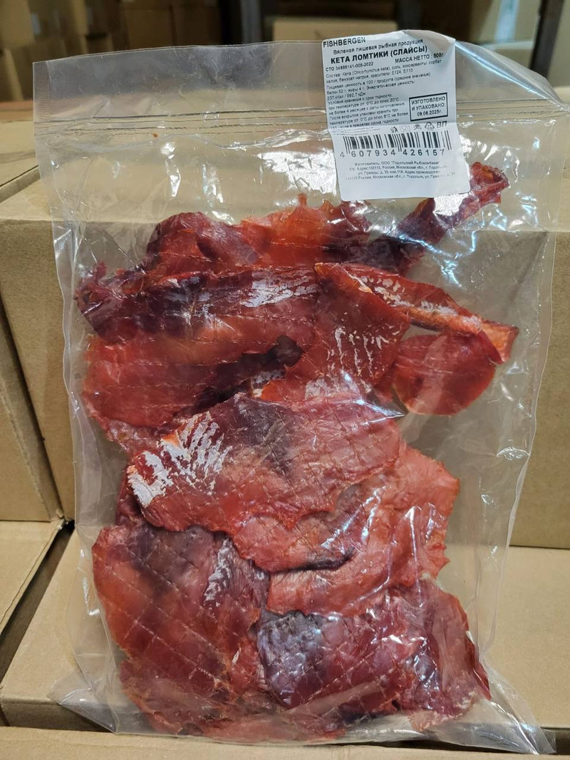 В наличии рыбные снеки, ломтики кеты, палочки кеты, стейки кеты вяленые, слайсы кеты вяленые.