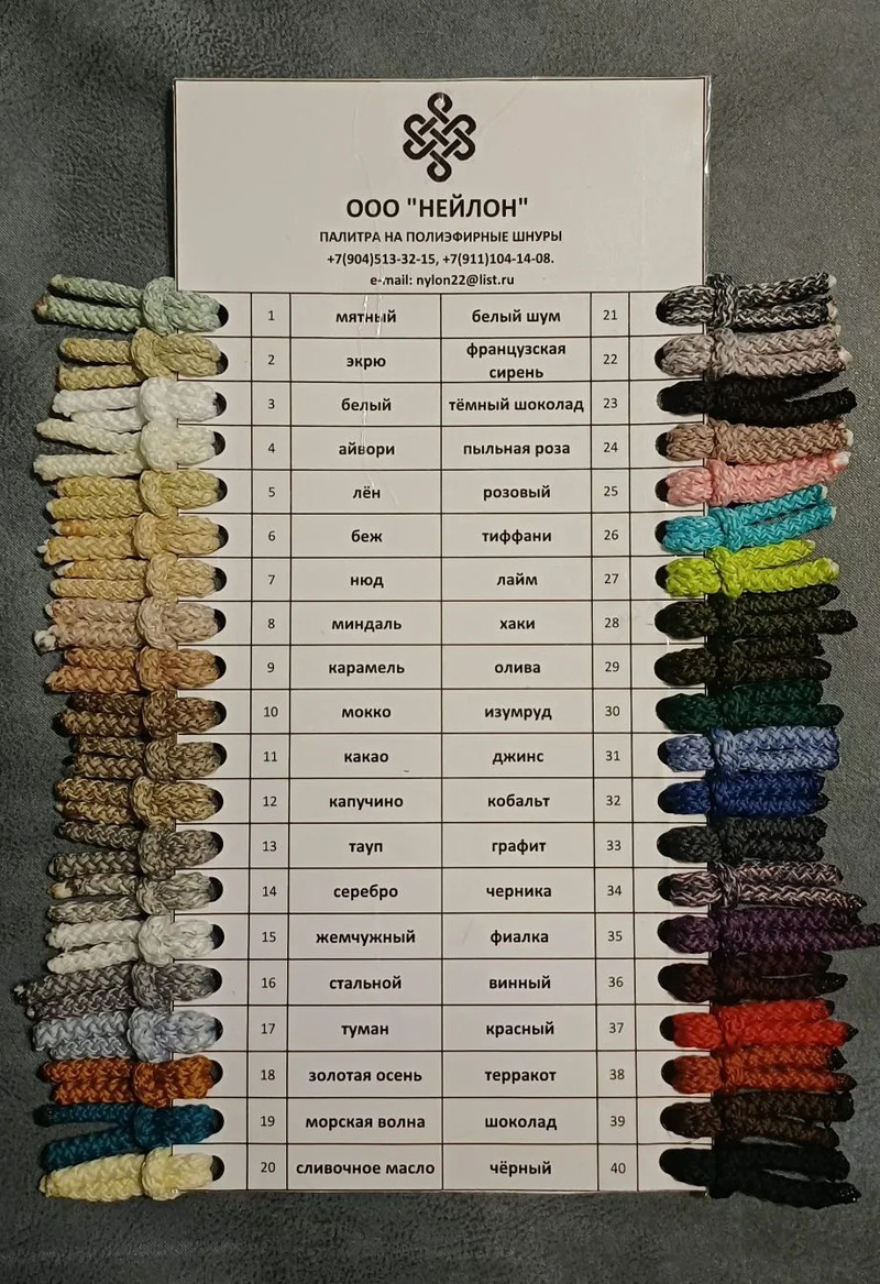 Шнур выполнен в диаметре 5мм полностью вязанием из полиэфира (оплётка и сердечник), тянется при нагрузке. Мягкий, что позволяет легко вязать его в узлы. Богатая палитра поможет выбрать вам наиболее подходящий оттенок для ваших изделий. Фасовка возможна непрерывным шнуром длинной 1000м в пакет, возможна бухточками по 50м, 100м и 200м. Цвета из наличия можно купить от 1 шт, на заказные цвета минимальный объём — 1000м в одном цвете.