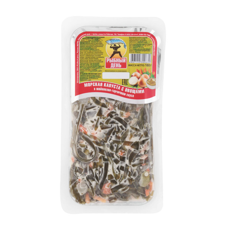 Чтобы купить Пресервы морская капуста с овощами в майонезно-горчичном соусе ООО "Рыбный день" 180 гр оптом по цене по запросу, свяжитесь с поставщиком. Компания поставщик — Рыбный день (ООО «Рыбный день») из города Артём (Приморский край). Доставка возможна транспортной компанией, авиатранспортом.