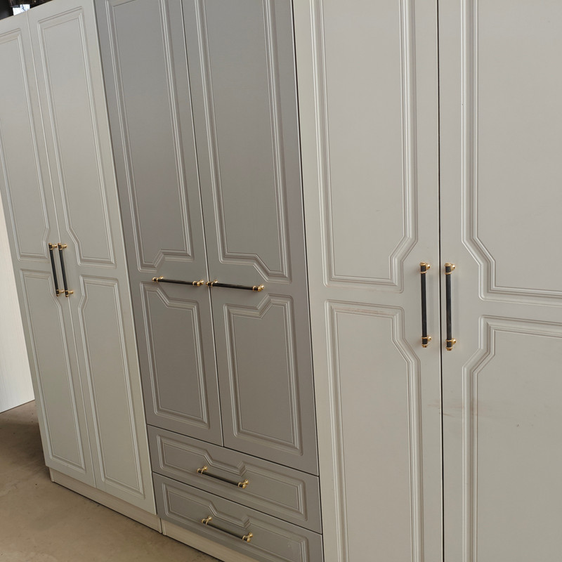 Светло-серый шкаф с объемными дверями и стильными ручками — подходит для любого интерьера.