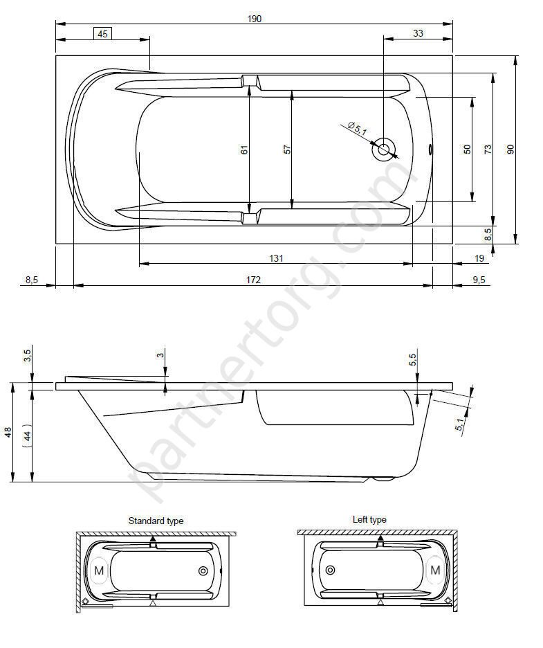 Размер: 190х90см. Глубина 48см. Объем 210 л. Цвет: белый. 100% акрил.