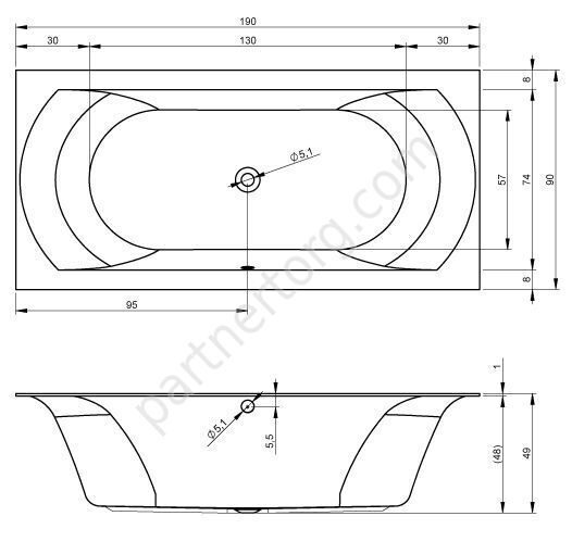 Размер: 190х90 см. Глубина 49 см. Объем 240 л. Цвет: белый. 100% акрил. С тонким бортом.