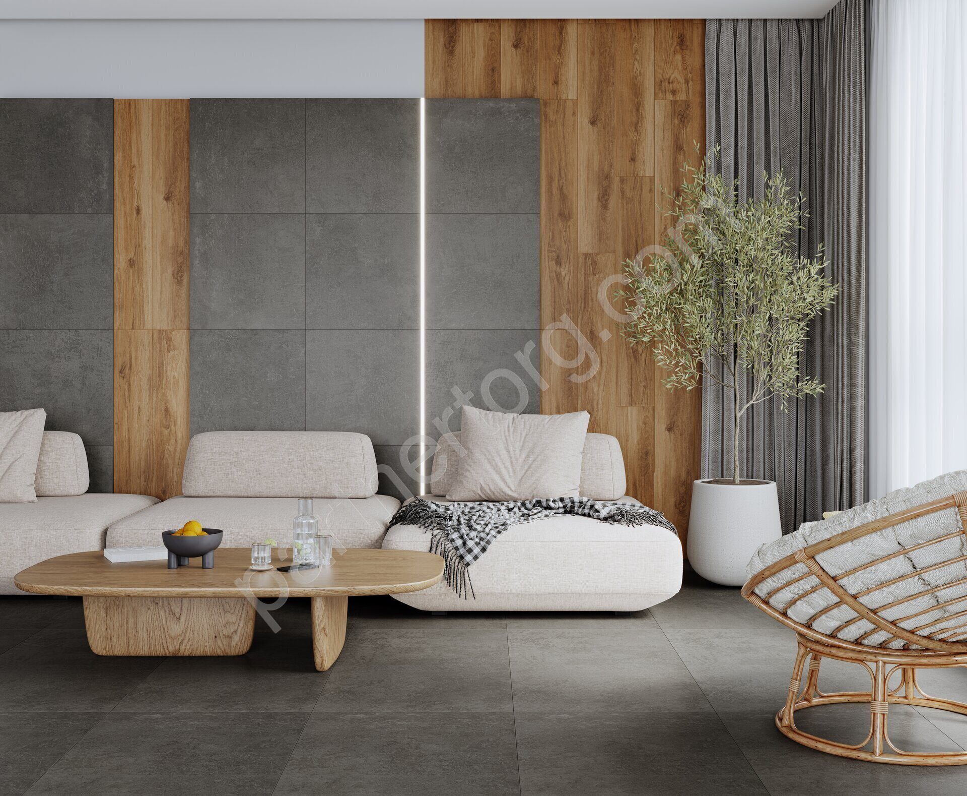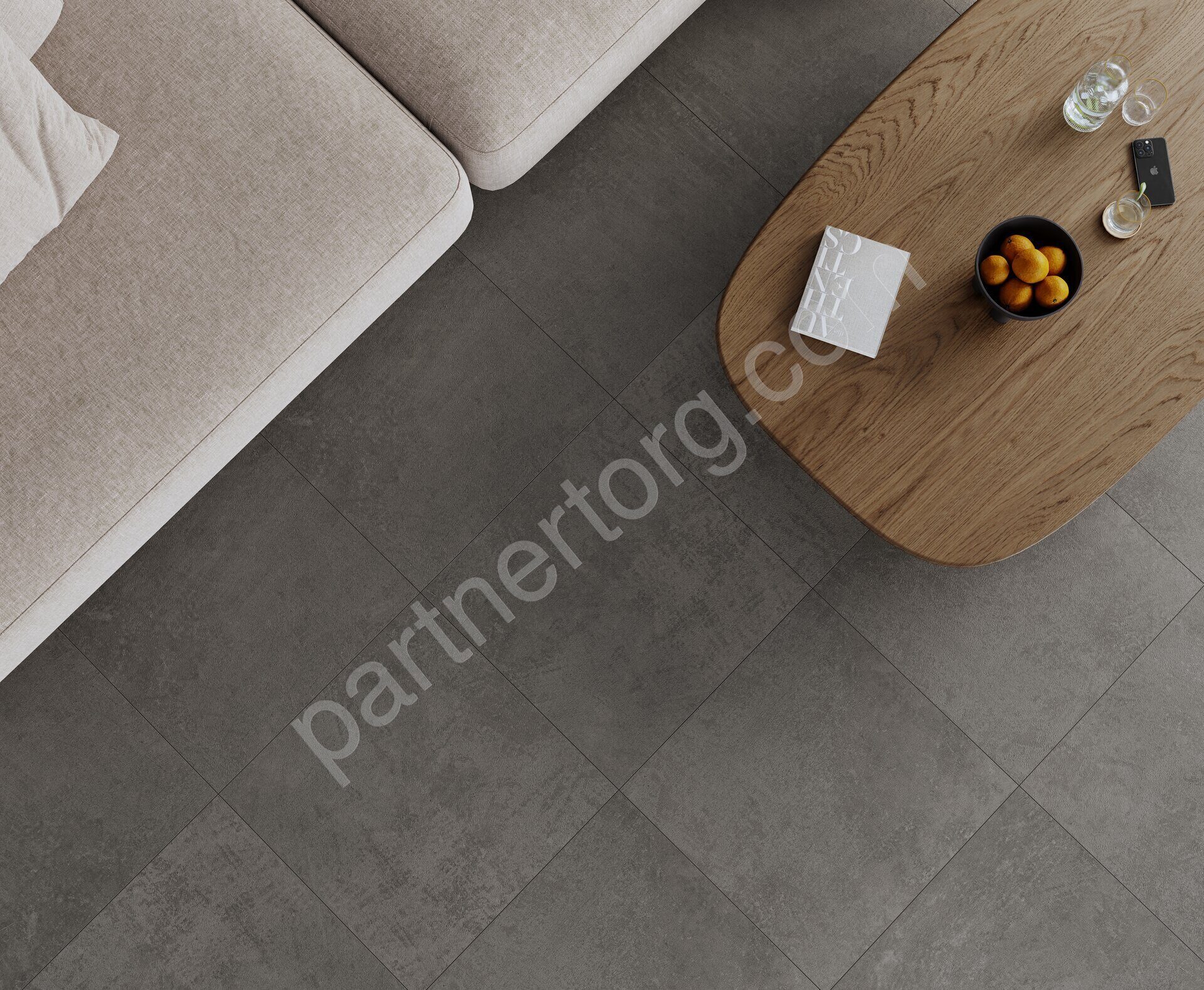 Размер: 59,5x59,5 см. Цвет: темно-серый, под бетон. Структурный. Матовый. Ректификат. Отпускается: кратно упаковке 1,8м2 /5 шт.