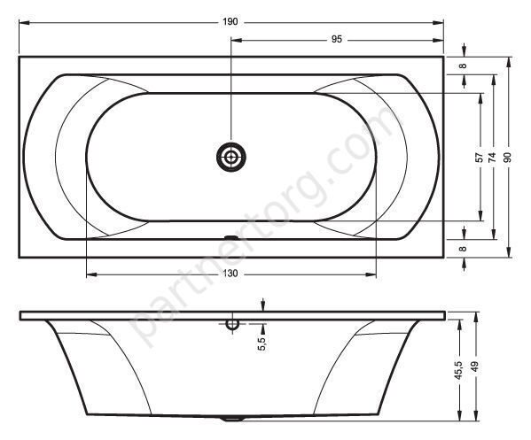 Размер: 190х90 см. Глубина 49 см. Объем 240 л. Цвет: белый. 100% акрил.