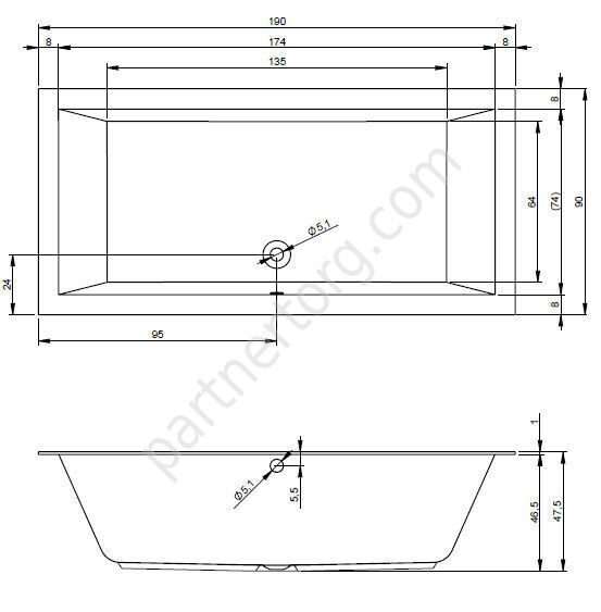 Размер: 190х90 см. Глубина 47,5 см. Объем 290 л. Цвет: белый. 100% акрил. С тонким бортом.