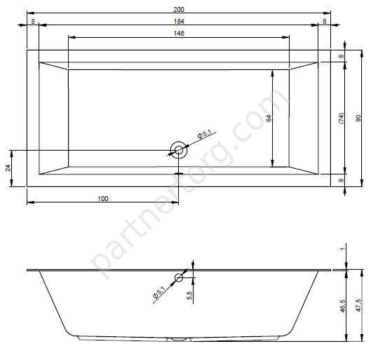 Размер: 200х90 см. Глубина 47,5 см. Объем 310 л. Цвет: белый. 100% акрил. С тонким бортом.