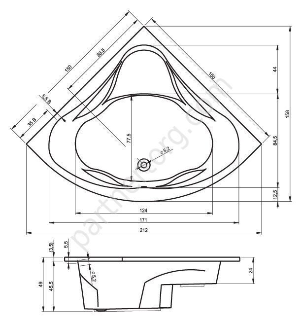 Размер: 150х150 см. Глубина 49 см. Объем 285 л. Цвет: белый. 100% акрил.