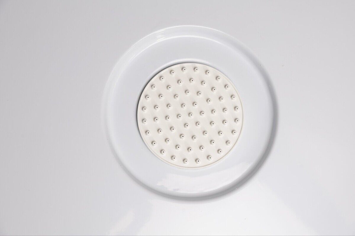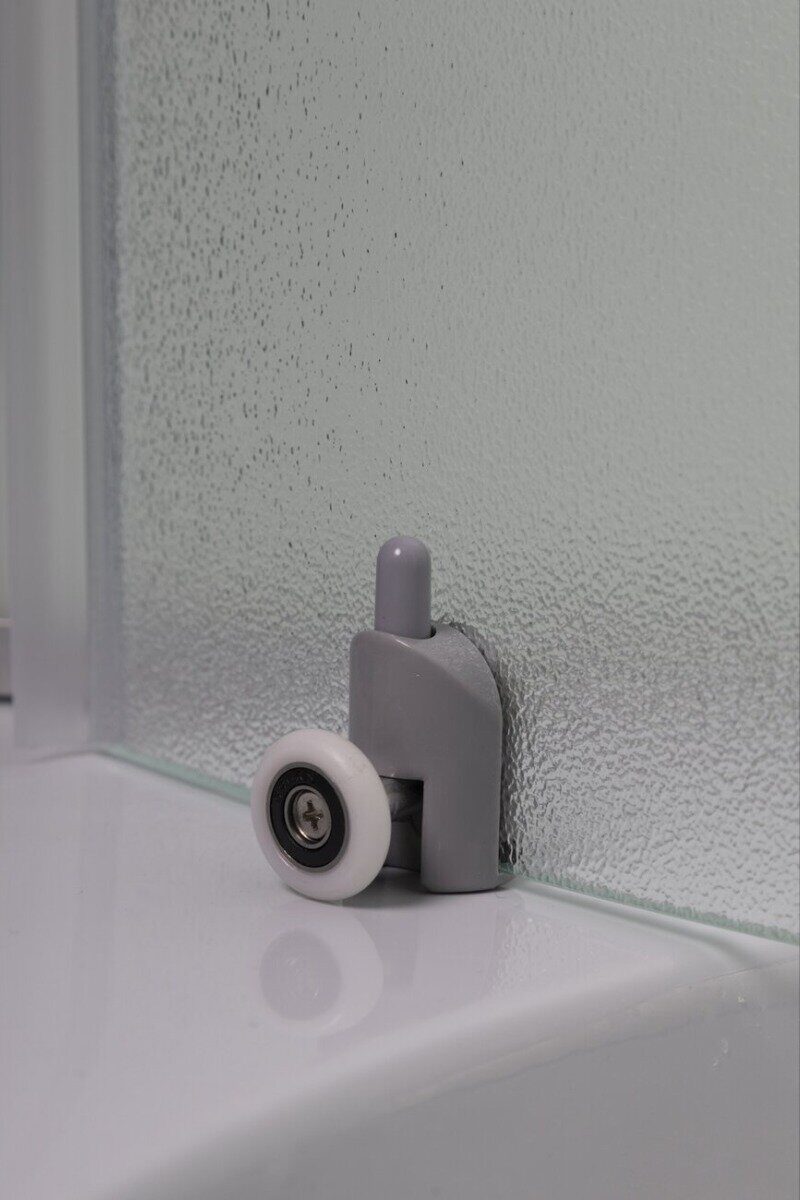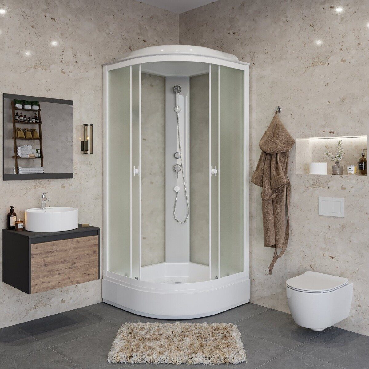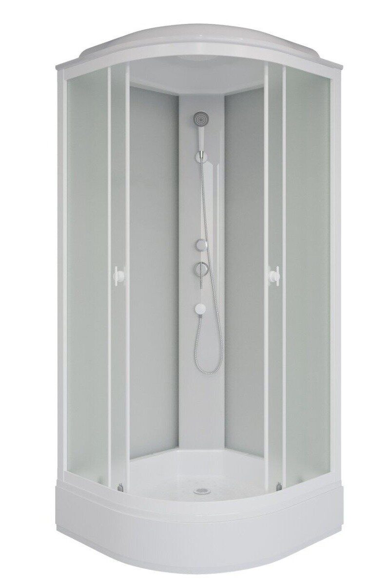 Размеры: 100х100х215 см. Крыша: есть. Вход: спереди. Средний поддон, материал - АБС-пластик, высота - 26 см, глубина - 13 см. Задние стенки: закаленное матовое стекло - 4 мм, двери: 2 шт, закаленное матовое стекло - 4 мм. Профиль алюминиевый, белый. Комплектация: ручной душ, полочка(опция), тропический душ (верхний). Управление: ручное.