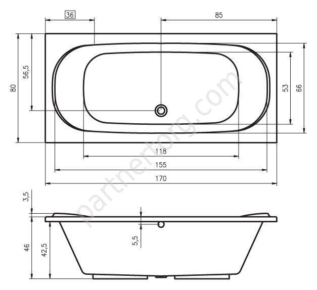Размер: 170х80 см. Глубина 46 см. Объем 155 л. Цвет: белый. 100% акрил.