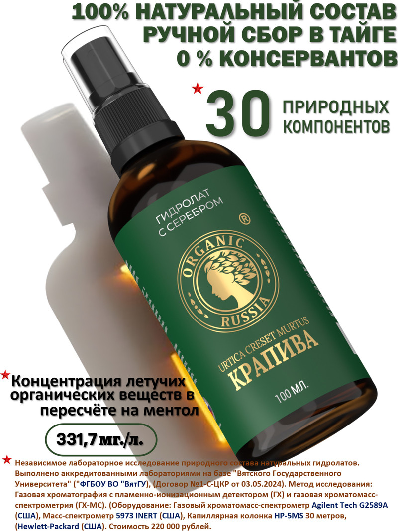 Серебро — природный антисептик усиливает действие гидролата крапивы и имеет свои собственные защитные и лечебные свойства. Улучшает проводимость нейронов в эпидермисе и клеточное питание кожи, усиливает действие гидролата и проникновение активных веществ в кожу. Микрочастицы серебра подавляют размножение микробов и грибка, борются с перхотью, а также работают на профилактику её появления. Гидролат крапивы от ORGANIC RUSSIA с коллоидным серебром уменьшает воспаления проблемной кожи с акне: угревой сыпи, прыщей, розацеа, камедонов (чёрных точек). Наночастицы коллоидного серебра благотворно воздействует на кожу, волосы и корни волос.