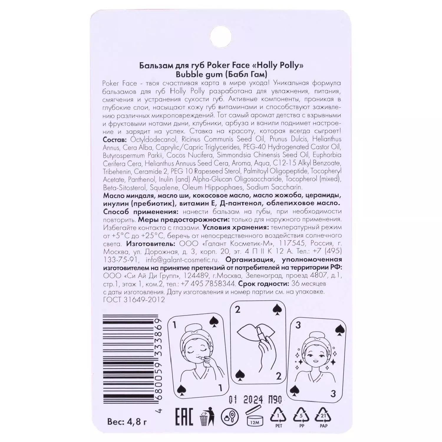 Уникальная формула бальзама для губ Holly Polly “Бабл Гам” разработана для увлажнения, питания, смягчения и устранения сухости губ. Активные компоненты, проникая в глубокие слои, насыщают кожу губ витаминами и способствуют заживлению различных микроповреждений. Тот самый аромат детства с взрывными фруктовыми нотами дыни, клубники, арбуза и ванили поднимет настроение и зарядит на успех. Ставка на красоту, которая всегда сыграет! АКТИВНЫЕ КОМПОНЕНТЫ Активы: масла миндаля, ши, кокосовое, жожоба и облепиховое, церамиды, инулин (пребиотик), витамин Е, Д-пантенол. Можно использовать детям с 3-х лет.
