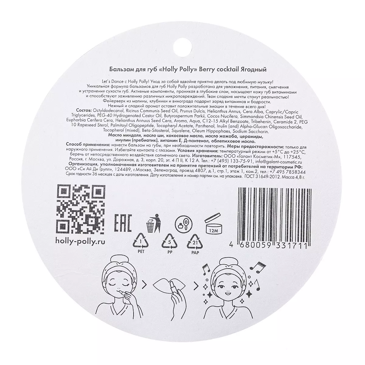 Let’s Dance c Holly Polly! Уход за собой вдвойне приятно делать под любимую музыку! Уникальная формула бальзамов для губ Holly Polly разработана для увлажнения, питания, смягчения и устранения сухости губ. Активные компоненты, проникая в глубокие слои, насыщают кожу губ витаминами и способствуют заживлению различных микроповреждений. Твои сладкие мечты станут реальностью! Фейерверк из малины, клубники и винограда подарит заряд витаминов и бодрости. Нежный и сладкий аромат оставит положительные эмоции в течении всего дня! АКТИВНЫЕ КОМПОНЕНТЫ Активы: масло миндаля, масло ши, кокосовое масло, масло жожоба, церамиды, инулин (пребиотик), витамин Е, Д-пантенол, облепиховое масло. Можно использовать детям с 3-х лет.