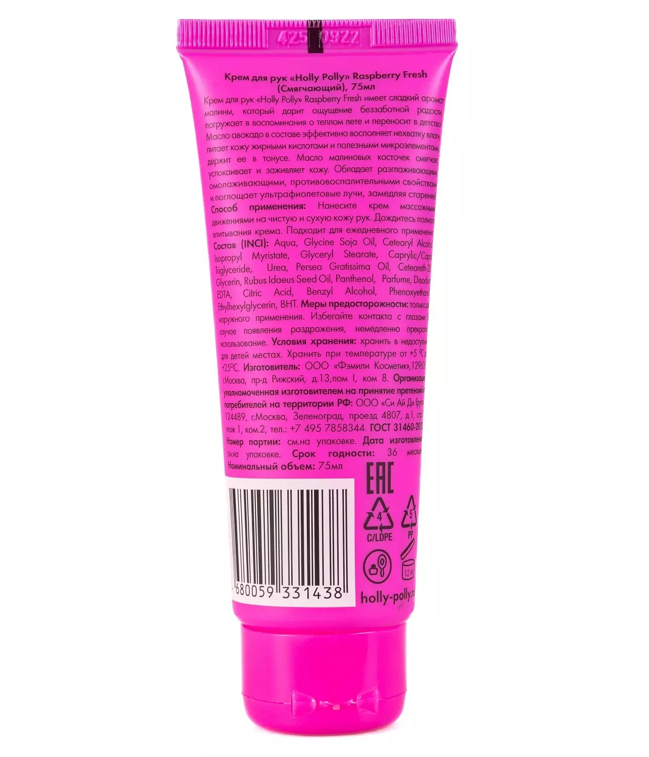 Невероятное удовольствие найти подходящее средство, которое бережно позаботится о твоих руках. Крем для рук Holly Polly Raspberry Fresh имеет сладкий аромат малины, смягчает и тонизирует кожу, повышает ее упругость и эластичность. Крем сохраняет естественный баланс кожи, делает ее мягкой, нежной и бархатистой! АКТИВНЫЕ КОМПОНЕНТЫ масло авокадо - восполняет нехватку влаги, питает и тонизирует кожу масло малиновых косточек - смягчает, успокаивает и заживляет.