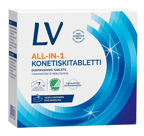 Таблетки для посудоемочной машины удаляют даже самые сложные пятна на посуде, предотвращают появление подтеков и образование известкового налета, придают блеск. Упакованы в защитную биоразлагаемую водорастворимую пленку (растворение за 12 мин. при температуре 40?С). Эффективно работают в экспресс-режиме мойки. Предотвращают помутнение стекла посудомоечной машины, защищают детали машины от коррозии и потемнения. Не содержат фосфаты, отдушки и красители. Состав одной упаковки - 40 таблеток. Разработано в сотрудничестве с “Союзом против аллергии и астмы Финляндии”.