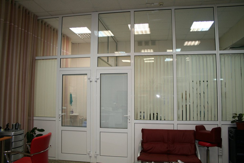 Пластиковая перегородка — это каркас из обычного ПВХ-профиля, в который вставлен “заполнитель” (сэндвич-панель или стекло).