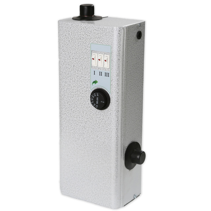 Электрокотел оснащен встроенными датчиком температуры, который позволяет автоматически поддерживать определенную температуру воды в отапливаемом помещении. Предусмотрен аварийный датчик, отключающий блок ТЭН в случае закипания воды.