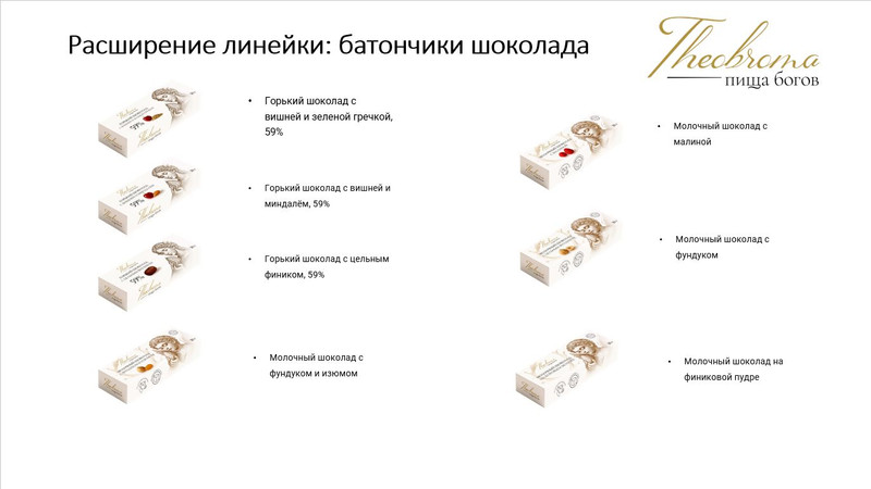 Линейку батончиков из горького и молочного шоколада с суперфудами (зеленая гречка, финик, вишня, малина), всего 8 вкусов.