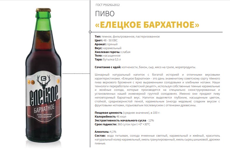 Шикарный натуральный напиток с богатой историей и отличными вкусовыми характеристиками. “Елецкое Бархатное” — это дань знаменитому советскому сорту темного пива верхового брожения с ярко выраженным солодовыми и хлебными нотами. Наши технологи переработали “советский рецепт”, используя собственные карамельные и жженые солода, которые производятся на специально сконструированных и установленных нашей инженерной группой солодовнях. Именно они придают пиву неповторимый бархатный вкус. Напиток выделяется глубоким, насыщенным цветом, стойкой, среднезернистой пеной, карамельным (иногда медовым) сладким вкусом с фруктовыми нотками, горьковатым послевкусием с оттенками древесины.