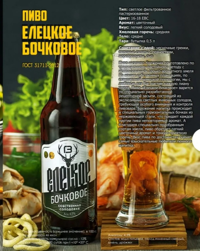 Благодаря специально подобранному ансамблю из сортов хмеля, пиво обретает легкий цветочный аромат и тонкую приятную горечь. Вкус “Елецкое Бочковое” по достоинству оценят самые взыскательные любители пенного напитка.