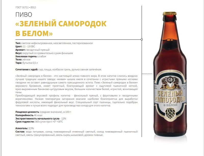 “Зеленый самородок в белом” — это настоящий алмаз пивного мира. В этом напитке слились воедино лучшие традиции нашего завода: “живая” шишка хмеля в сочетании с игристыми нотками гвоздики не оставит равнодушным самого пресыщенного эстета. Пиво “Зеленый самородок в белом” верховного брожения, имеет приятный, благоухающий аромат с ощутимой пшеничной ноткой, ярко-выраженным бананово-цитрусовым вкусом, большим количеством белой, игристой, вскипающей пены.