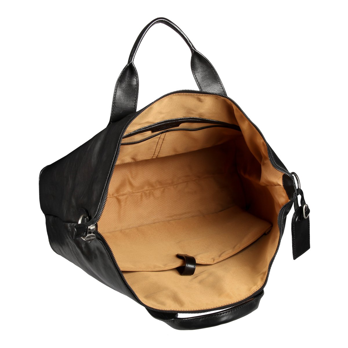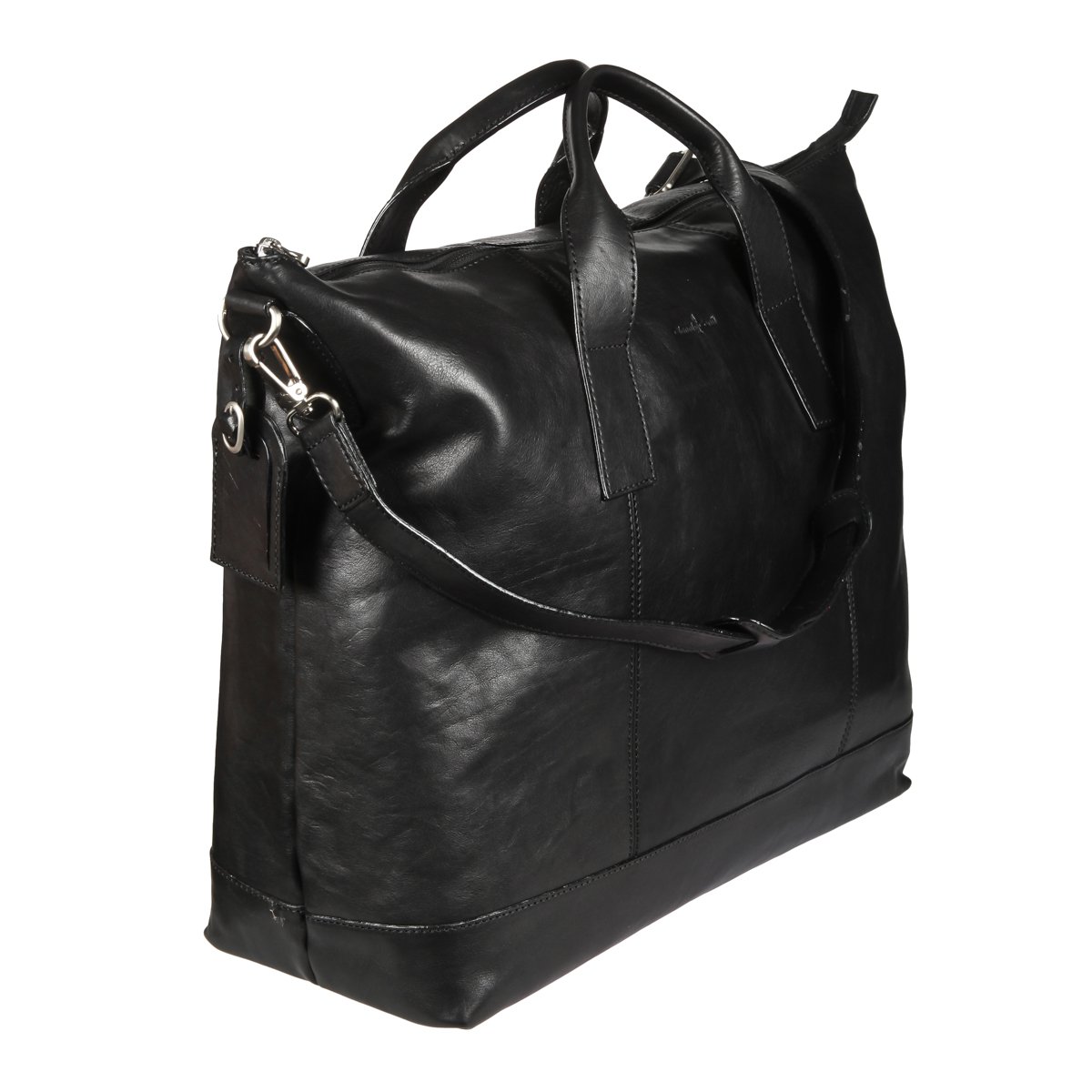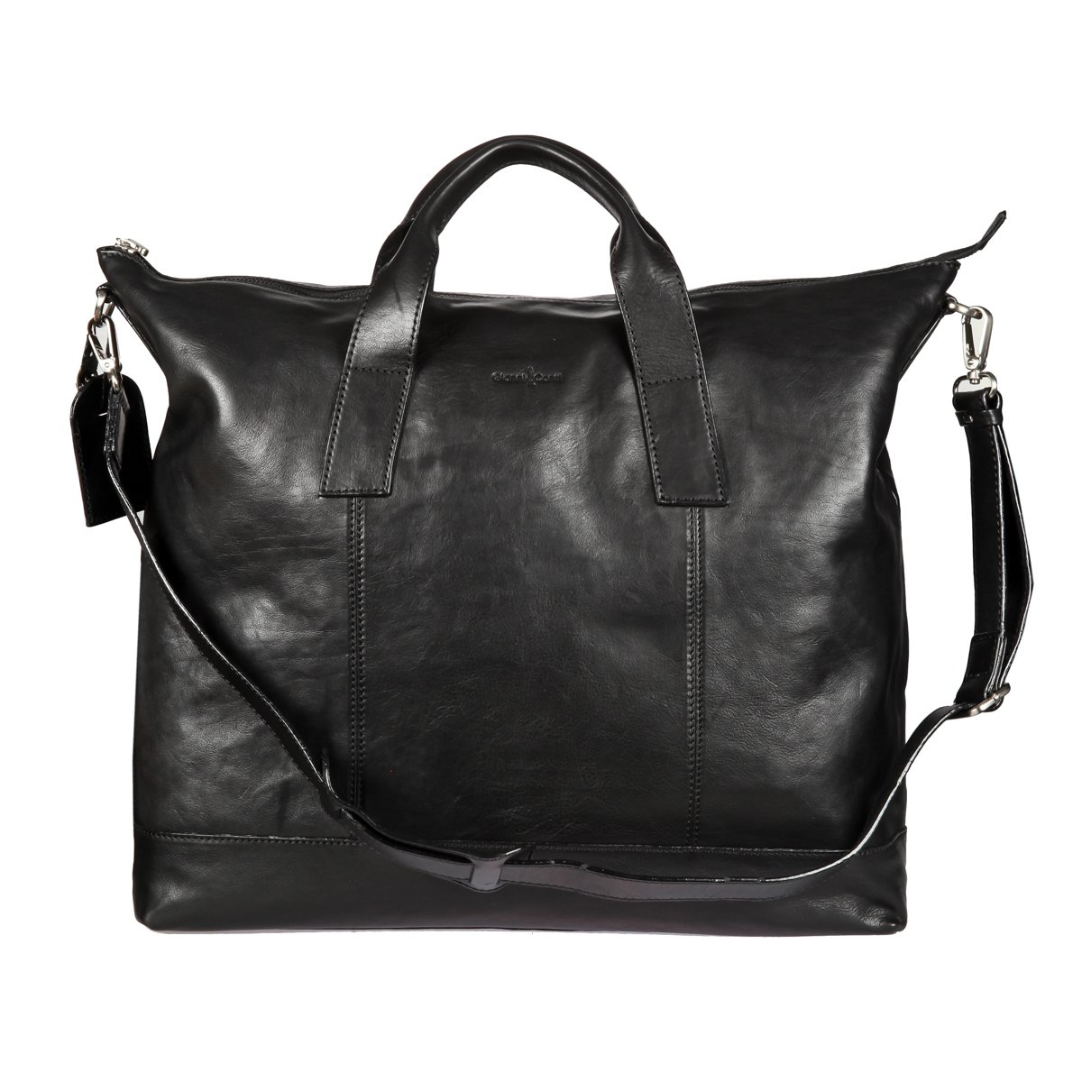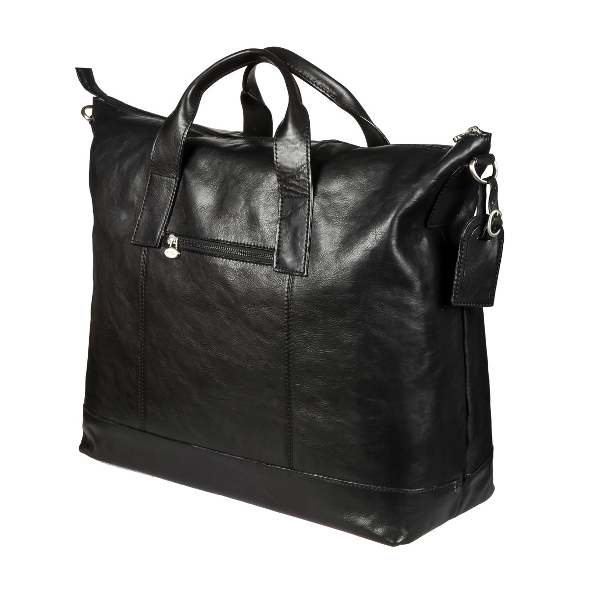 Вместительная кожаная дорожная сумка чёрного цвета. Внутри одно большое отделение для вещей, отдел для ноутбука на липучке, карман для документов на молнии и два кармашка для мелких предметов. На задней стенке карман на молнии. Оснащена съёмным регулируемым плечевым ремнём на карабинах.