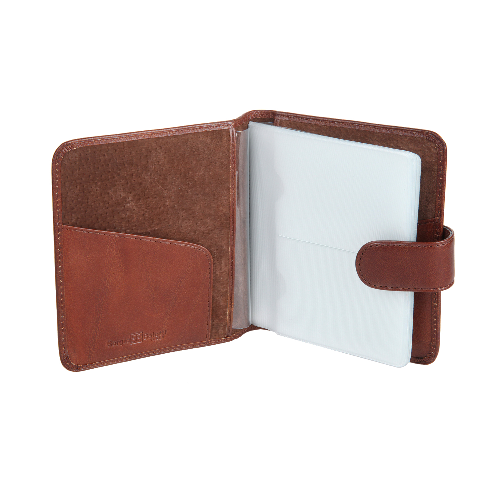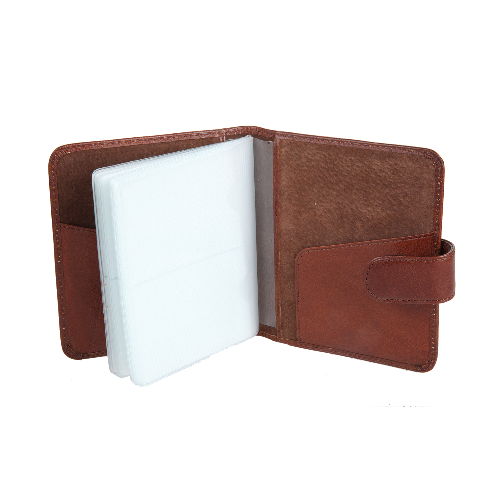 Удобная визитница из премиальной натуральной кожи Vachetta. Внутри съёмный блок прозрачных файлов. 12 листов вмещающие 24 карточки. Внутренние стороны идентичны и имеют по одному угловому кармашку для бумаг. Закрывается клапаном на кнопке. Товар упакован в подарочную коробку от бренда Sergio Belotti.