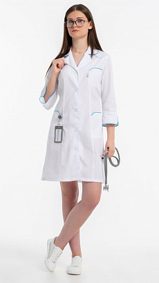 Халат медицинский женский, полуприлегающего силуэта с центральной бортовой застежкой на 5 петель и 5 пуговиц.