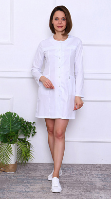 Халат женский полуприлегающего силуэта с центральной бортовой застёжкой на 7 кнопок, без воротника.