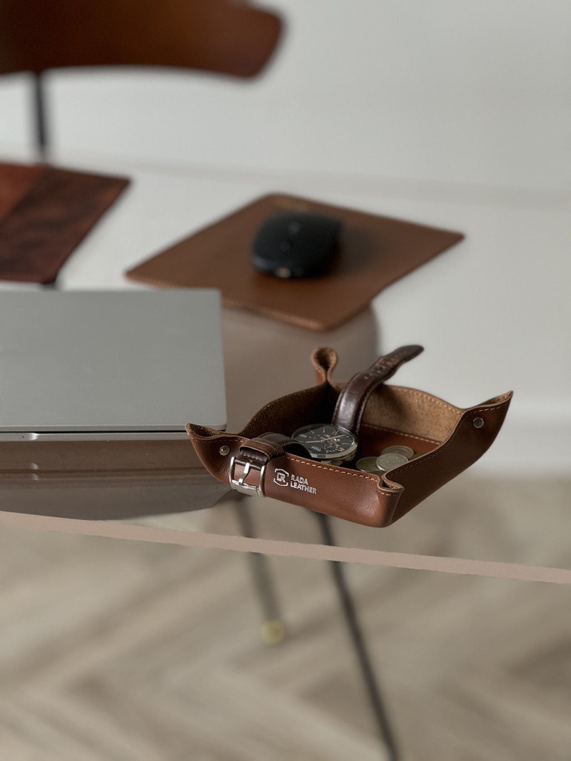 Коробочка из натуральной кожи для мелочей. Можно использовать на рабочем столе, в прихожей, в зоне столовой.