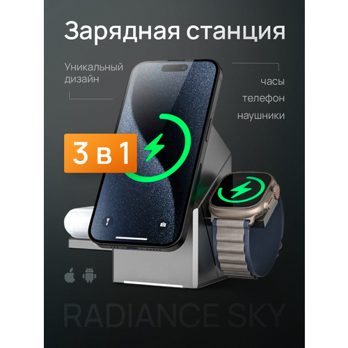 Беспроводная зарядная станция 3 в 1 - станет незаменимым аксессуаром на рабочем столе или прикроватной тумбочке, поможет избавиться от лишних проводов и навести порядокСтанция поддерживает.