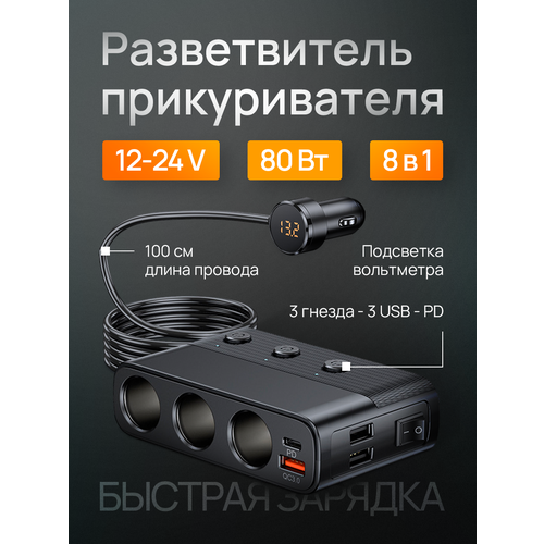 Разветвитель с USB портом для автомобиля. Разветвитель предназначен для удобной зарядки различных устройств в автомобиле.Оснащенный разъемами и гнездами для подключения до семи устройств.